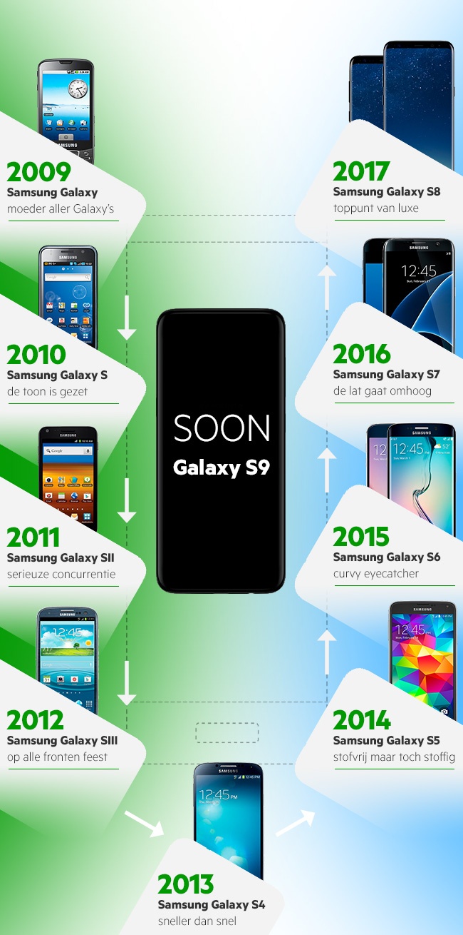 Nog maar een paar nachtjes slapen… Dan onthult Samsung de nieuwe Galaxy S9! De Galaxy serie bouwde in de loop der jaren een indrukwekkende reputatie op. Zo bracht Samsung vanaf 2009 elk jaar een Galaxy model op de markt met de nieuwste innovaties. We blikken terug op 9 jaar Samsung Galaxy!