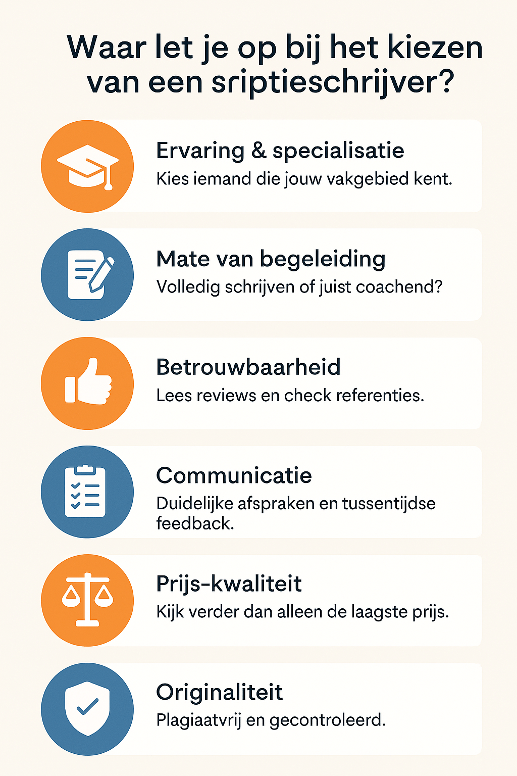Sommige scriptieschrijvers nemen het volledige schrijfproces op zich, terwijl anderen vooral coachend werken en feedback geven. Bedenk vooraf wat jij nodig hebt. Wil je dat iemand jouw tekst herschrijft, of zoek je meer begeleiding bij het structureren en redigeren? Een transparante aanpak voorkomt misverstanden.